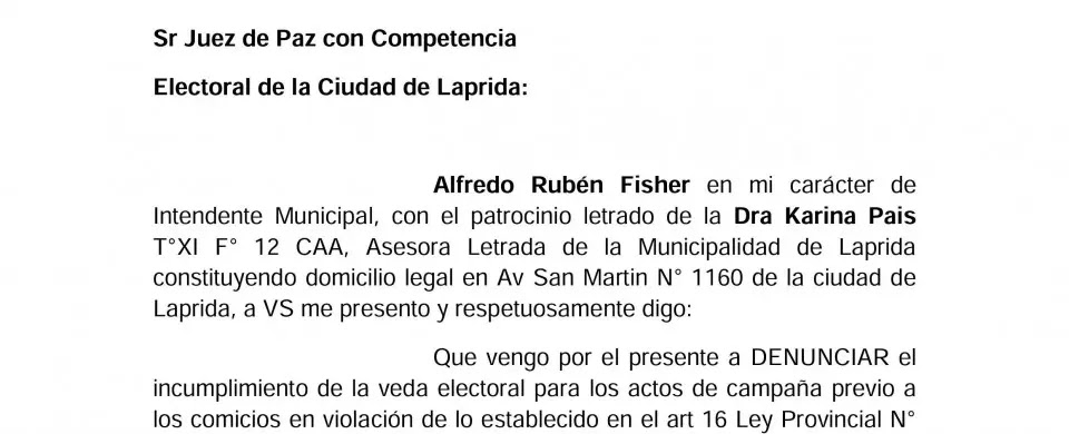 El Intendente Alfredo Fisher presentó hoy una denuncia por presunto ” incumplimiento de la veda electoral” ante el Juez de Paz en competencia electoral de Laprida.