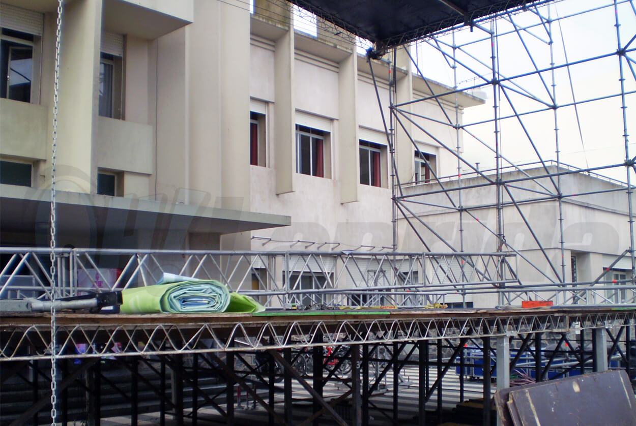 Faltando horas para que comiencen los festejos por el aniversario de Laprida, ya empezó el armado del megaescenario en la Av. San Martín entre Av. Pereyra y Pellegrini.