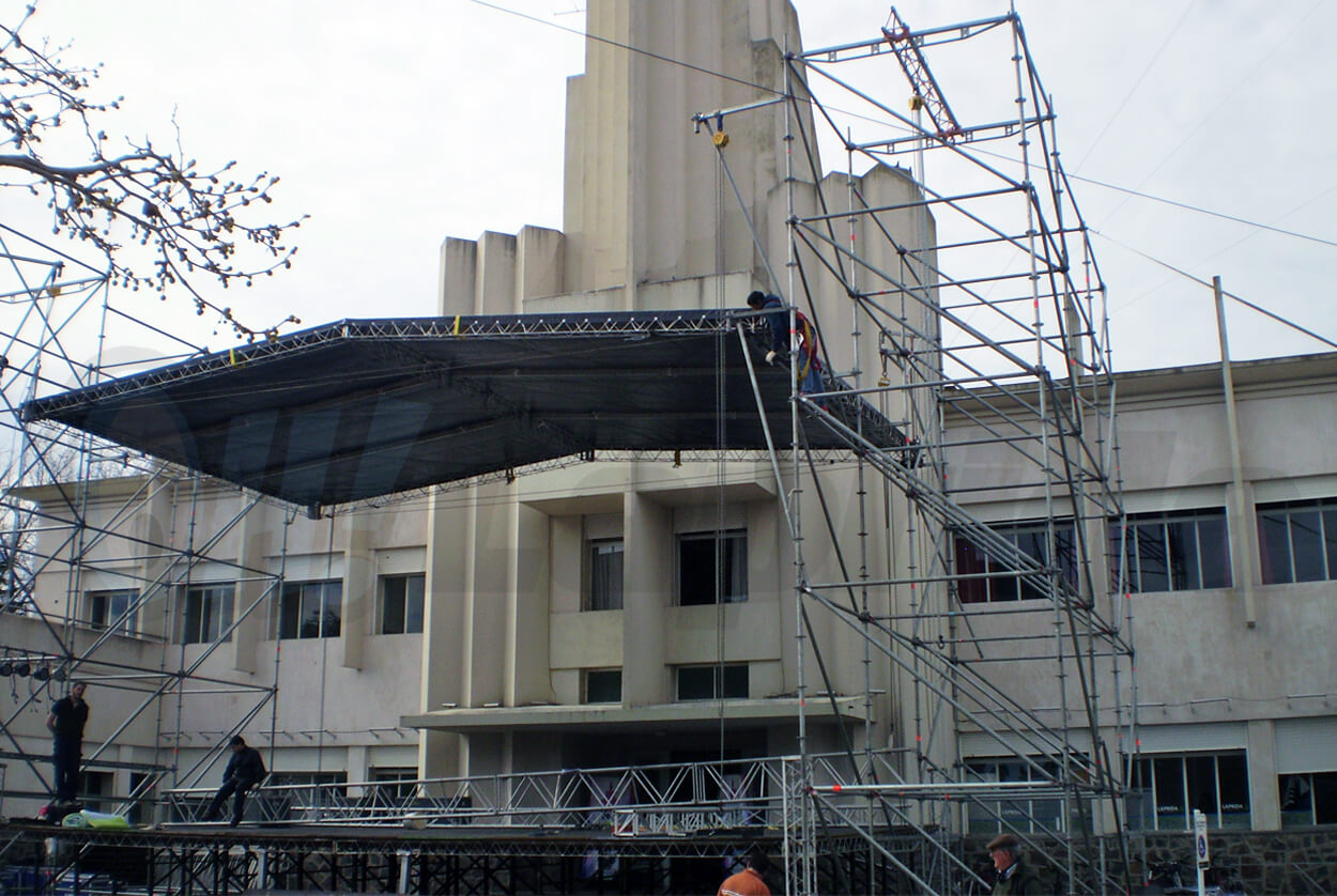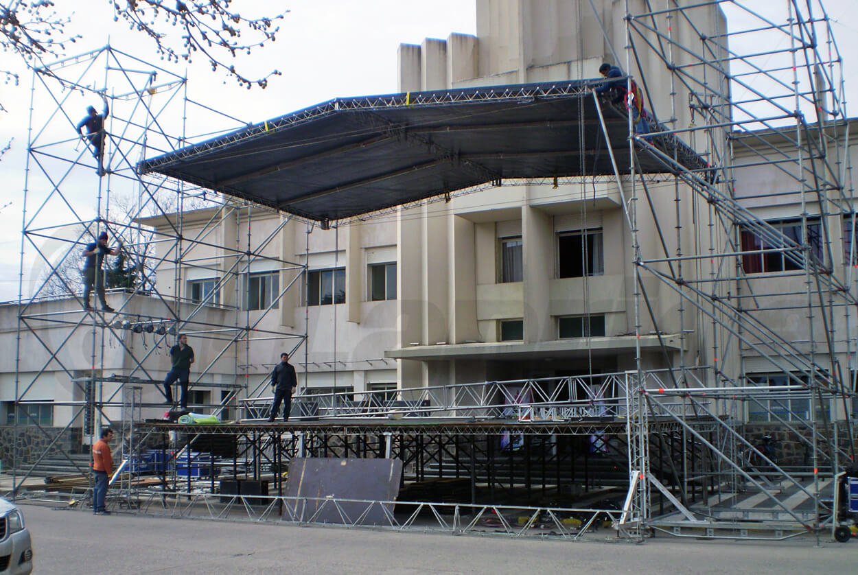 La estructura esta siendo instalada en la vereda de la Municipalidad y allí actuarán, entre otros, Rocío Quiróz junto a Coti Sorokín este 16 de septiembre.