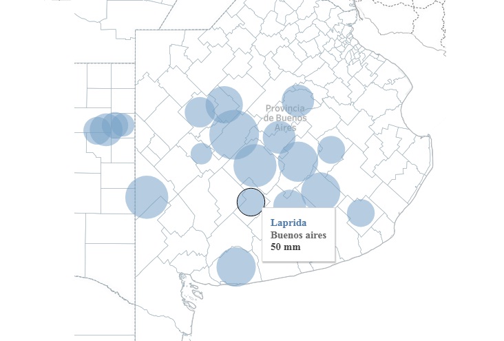 Otras ciudades de la zona que aparecen en el mapa son Azul, con 105 milímetros registrados, Benito Juárez con 70mm y Tandil con 100mm.