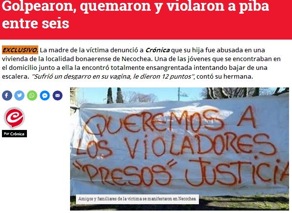 El caso de una joven de 17 años que fue abusada sexualmente por seis jóvenes en una previa en una casa de Necochea fue cubierto en éstos días por Crónica TV.