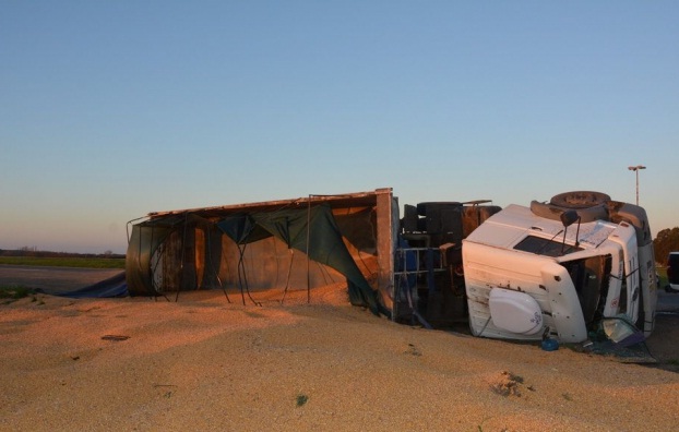 Un camión que iba cargado con maíz sufrió un vuelco este lunes en la rotonda entre las rutas 51 y 85, cerca de La Tacuarita en Coronel Pringles.