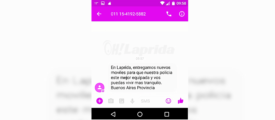 “En Laprida entregamos nuevos móviles para que nuestra policía este mejor equipada” dice el SMS que recibieron varios vecinos en su teléfono celular.