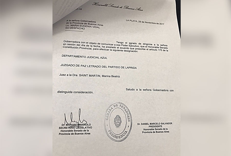 Sucedió que el Senado de la Provincia aprobó el pliego pero aún faltan dos pasos, dos instancias institucionales, para que Saint Martín sea Jueza de Paz en Laprida.